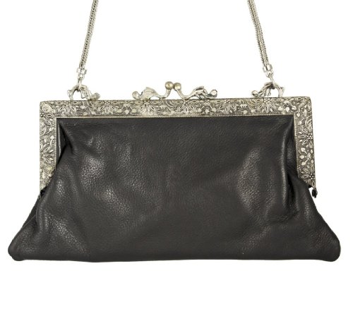 | Post Date : Apr 19, 2012 08:01:27 | Usually ships in 1-2 business daysOur Vintage Style Black Leather bag has a metal frame with metal clasp closure. The strap is metal with elegant beading detailing. This little handbag just screams Rock n Roll baby. Fully lined. Made in India. Measures 10 1/2 inches x 5 1/4 inches not counting the strap.Real Leather Rock n Roll Handbag with classic evening bag styling.